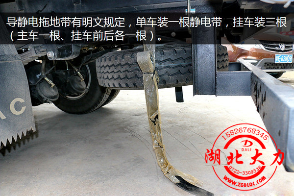 國家對危運車輛使用的導靜電拖地帶有明文規(guī)定,單車必須裝一根靜電帶,掛車裝三根(主車一根、掛車前后各一根),并要求所有的靜電帶空、重車和停駛都必須拖地。特別提醒:如果車身或車廂較長、較寬可根據(jù)實際需要多安裝一條或幾條導靜電拖地帶。