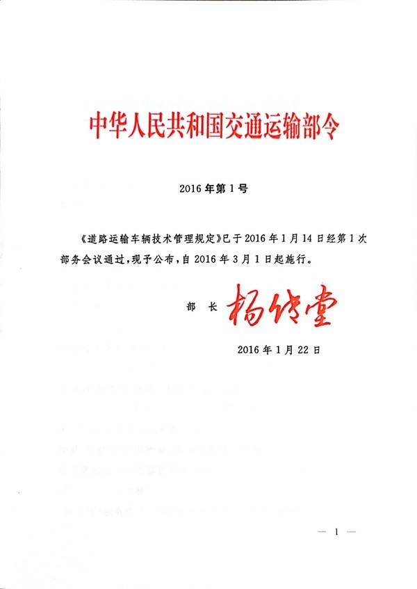 1月29日,中華人民共和國(guó)交通運(yùn)輸部部長(zhǎng)楊傳堂簽字,交通部令2016年第1號(hào)《道路運(yùn)輸車輛技術(shù)管理規(guī)定》已于2016年1月14日經(jīng)第1次部務(wù)會(huì)議通過(guò)公布,并將在2016年3月1日起施行。這是《道路運(yùn)輸車輛技術(shù)管理規(guī)定》交通部令2001年第4號(hào)后這15年來(lái)首次更新發(fā)布的行業(yè)政策。以下是交通部令2016年第1號(hào)《道路運(yùn)輸車輛技術(shù)管理規(guī)定》原文: