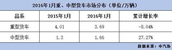 根據(jù)中汽協(xié)最新發(fā)布的2016年1月份貨車市場(chǎng)產(chǎn)銷數(shù)據(jù),1月份重卡銷量36872輛,同比下降8.04%;中卡銷量16603輛,同比增長(zhǎng)27.27%。從數(shù)據(jù)上來(lái)看,重卡由去年的近三成降幅縮減為8%,中卡更是一改長(zhǎng)久以來(lái)的下降之勢(shì),同比上升近三成,開(kāi)年局勢(shì)見(jiàn)漲。