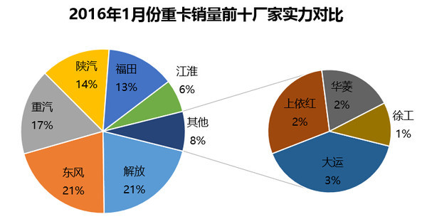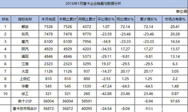 1月份重卡銷量前十名依次為解放、東風(fēng)、重汽、陜汽、福田、江淮、大運(yùn)、上依紅、華菱、徐工。前十廠商銷量占去整個(gè)重卡市場(chǎng)97.65%的比例,強(qiáng)者越強(qiáng)的效應(yīng)凸顯。其中,解放重卡銷量7526輛,同比上升72.14%,成為當(dāng)月銷量冠軍。第二名東風(fēng)銷量7478輛,同比下降23.46%;第三名重汽銷量6100輛,同比下降23.33%。