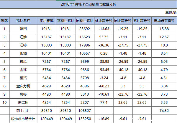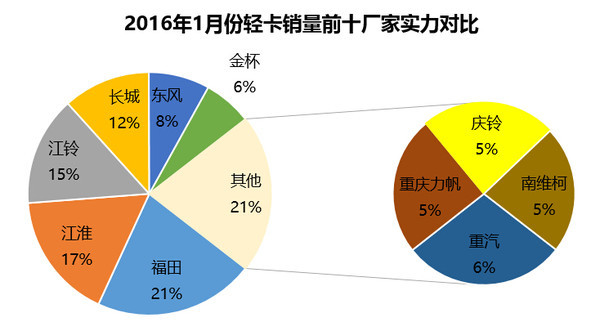 輕卡銷量前十廠商依次為福田、江淮、江鈴、長(zhǎng)城、東風(fēng)、金杯、重汽、力帆、慶鈴、南維柯。這十個(gè)廠商銷量占去74.32%的輕卡市場(chǎng)。其中前三位福田、江淮、江鈴合計(jì)占據(jù)39.25%的市場(chǎng),近四成的市場(chǎng)占有率。