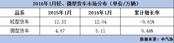1月份輕卡銷量120449輛,同比下降9.61%;微卡銷量51129輛,同比增長(zhǎng)9.44%。