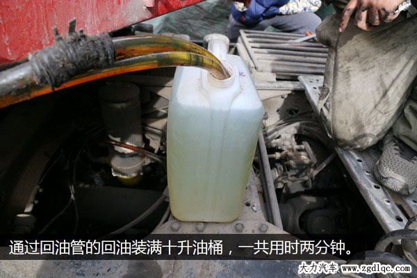 通過回油管取油的速度取決于回油量,所以借著這次機(jī)會(huì)正好還能對(duì)回油量進(jìn)行一次測試,一舉兩得。經(jīng)過測試,從啟動(dòng)發(fā)動(dòng)機(jī)到把十升的油桶灌滿,一共用時(shí)兩分零五秒,可見電控共軌發(fā)動(dòng)機(jī)的柴油循環(huán)流量非常的大。