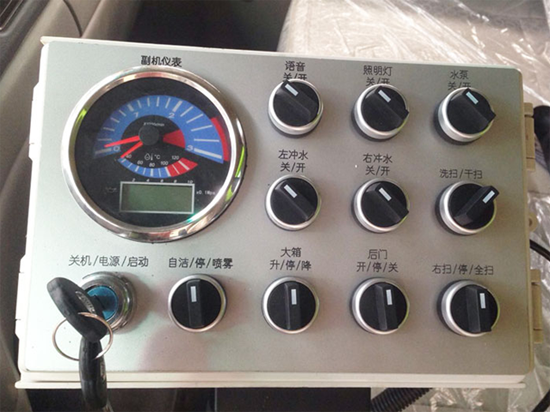 13. 液壓元件采用集成疊加設(shè)計(jì),駕駛室電液集中控制,操作方便。駕駛室手動(dòng)按鈕式液壓系統(tǒng)驅(qū)動(dòng)左右立掃升降、左右掃肋旋轉(zhuǎn)、吸嘴升降、垃圾箱后門開(kāi)閉、垃圾箱傾翻復(fù)位等機(jī)械動(dòng)作。(圖6)