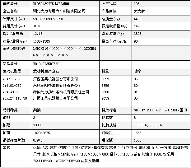東風輕卡系列加油車有,東風小霸王,東風福瑞卡,東風多利卡等,按公告尺寸罐體容積可達6.3立方,朝柴96馬力,2.2噸前橋,后橋3噸,氣剎,軸距:3300,歐二底盤,改國三手續(xù),7.00輪胎,整車價格:6.95萬元(含稅控加油機及15米加油管)。
