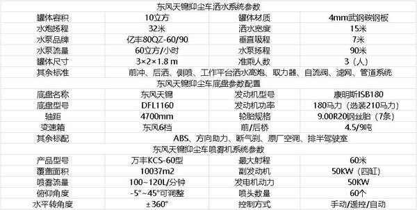 東風天錦抑塵車采用東風天錦DFL1160BX底盤,康明斯180馬力(選裝210馬力)國五發(fā)動機,東風6檔變速箱,軸距4700mm,9噸后橋,9.00R20原廠鋼絲胎,排半帶臥可前翻駕駛室,原廠abs,原廠空調,帶方向助力,離合助力器,氣剎制動。