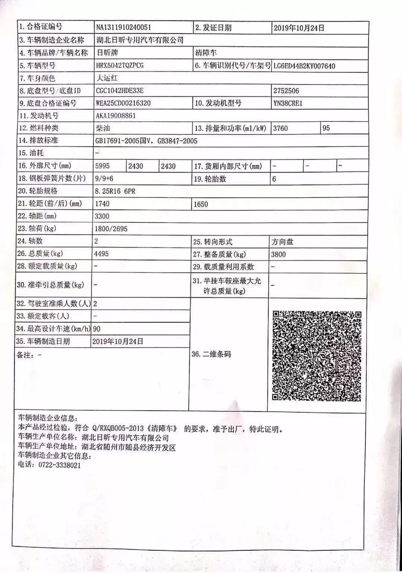 上圖是該車的合格證,圖中可以清楚的看到車輛名稱為清障車,整備質量3800kg。