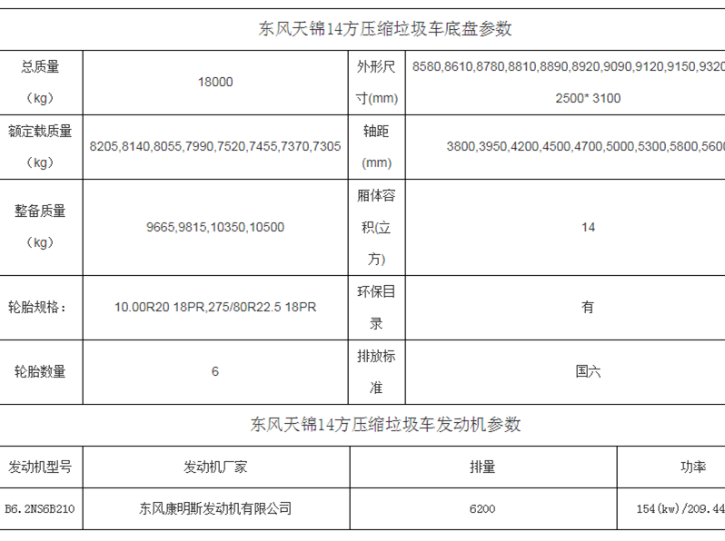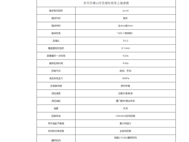東風(fēng)天錦14立方壓縮垃圾車上裝參數(shù)配置詳情表