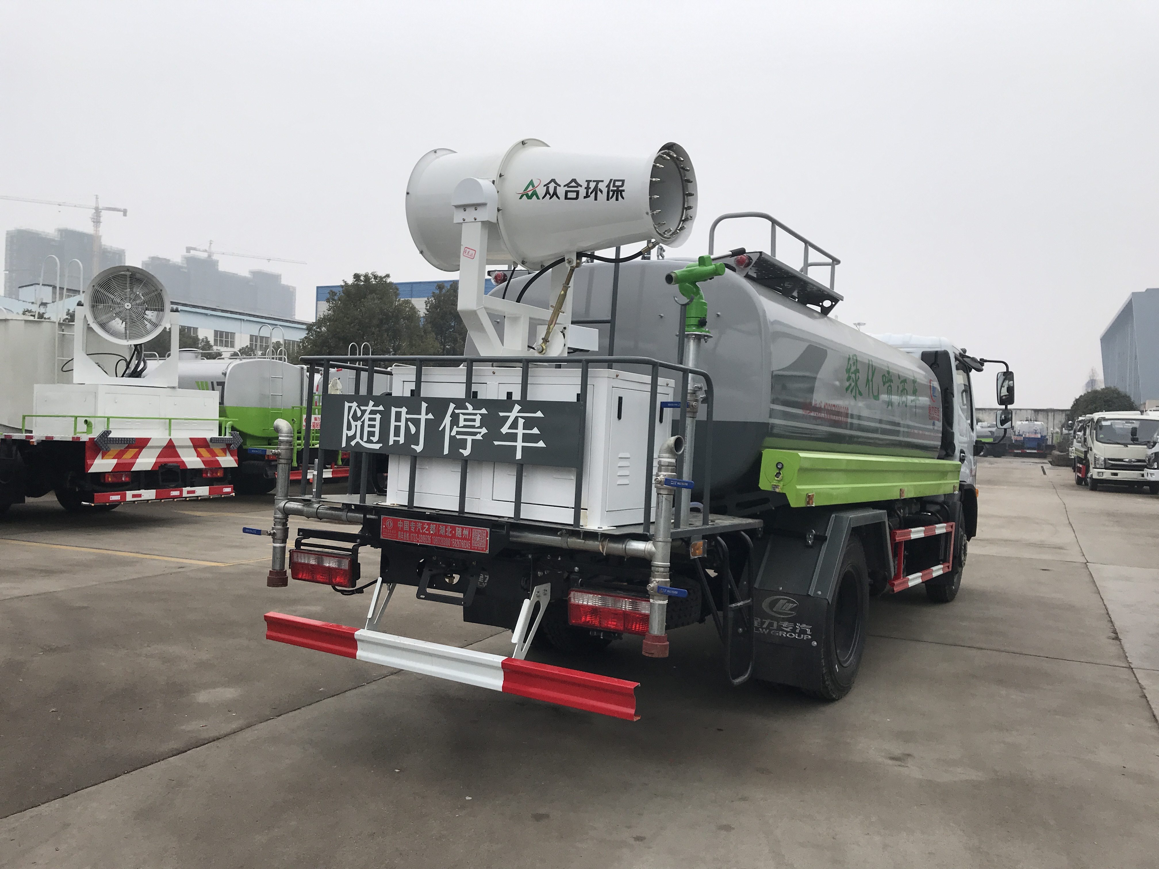 上裝配置:罐體采用武鋼Q235優(yōu)質(zhì)碳鋼板制作,前沖(噴)后灑,帶側(cè)噴,罐體后帶工作平臺(tái),帶水槍,可連續(xù)調(diào)成直沖狀、大雨、小雨、毛毛雨,帶安全護(hù)欄,配備灑水車專用灑水泵,泵可自吸自排,安裝過濾網(wǎng),帶消防接口,可通過消防栓進(jìn)水,帶自流閥,帶灑水音樂喇叭,配備兩根等長(zhǎng)輸水管,加裝30米霧炮(帶汽油發(fā)電機(jī)組)。