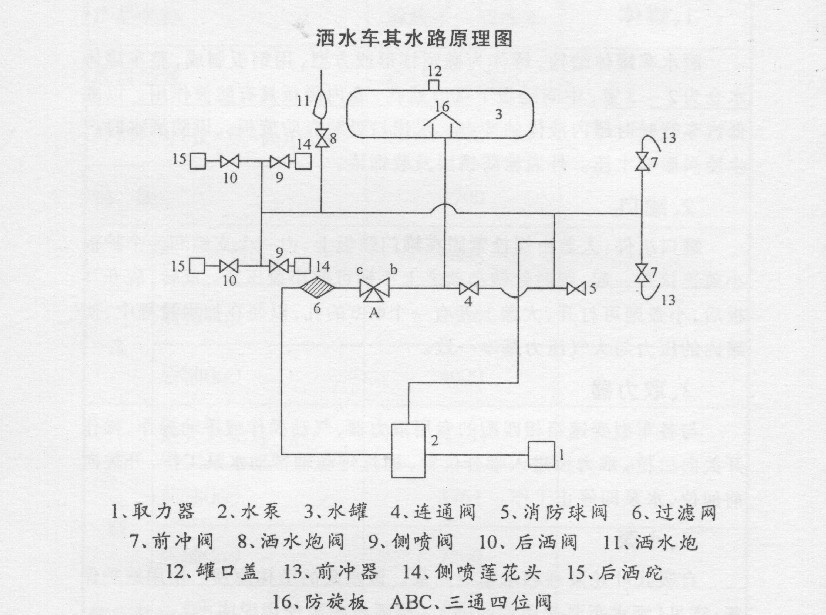 (2)灑水:將四位三通閥1的標(biāo)記擰到B處,使A-C相通,關(guān)閉球閥1和2及不用的灑水噴頭,打開要用的灑水噴頭,拉動取力器開關(guān),使水泵工作,即可開始灑水,停止工作時取力器開關(guān)回位,并將各閥門回味。