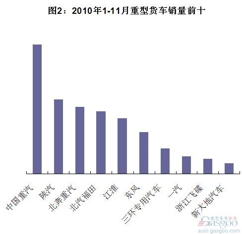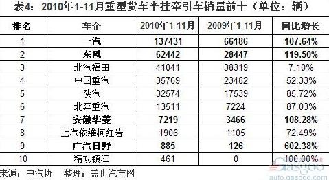 2010年1-11月,中國重卡(含整車、非完整車輛和半掛牽引車)銷量同比大增64.45%至94.18萬輛。其中,重卡整車和半掛牽引車的銷量增長率最高,分別同比增長87.68%和79.42%,至22.63萬輛和33.41萬輛。重卡非完整車輛(指底盤)增速最低,為43.44%,但總量在三個子類中仍最高,為38.15萬輛。