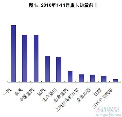 銷量前十的重卡企業(yè)為一汽、中國重汽、東風(fēng)、北汽福田、陜汽、北奔重汽、上汽依維柯紅巖、安徽華菱、江淮、三環(huán)專用汽車。
