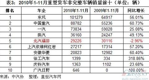 今年1-11月,北汽福田的重卡非完整車輛銷量同比下降2.96%至2.92萬輛,是重卡非完整車輛銷量前十企業(yè)中唯一一個出現(xiàn)負(fù)增長的企業(yè)。一汽也僅增長25.08%至7.38萬輛。