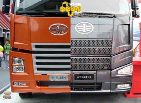從正面看,顯然J6H的駕駛室被抬高了之后,最上面一條進氣格柵幾乎不起什么作用了,雖然他的進氣格柵總面積與J6HC幾乎一樣大,但有效的進氣面積會變小。從這個角度看,中間的補丁的確破壞了駕駛室的整體感。