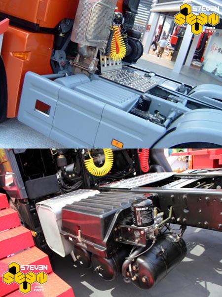 從后面看,J6HC的空濾雖然沒有布置在底盤里或者駕駛室下方,但總體結(jié)構(gòu)比較緊湊。但是J6H不但駕駛室打了補丁,進氣管也打了補丁,硬生生的加長了一截,看起來很怪異。另外膨脹水箱也沒有收納起來,而是外露在駕駛室后圍上,讓人感覺十分遺憾。
