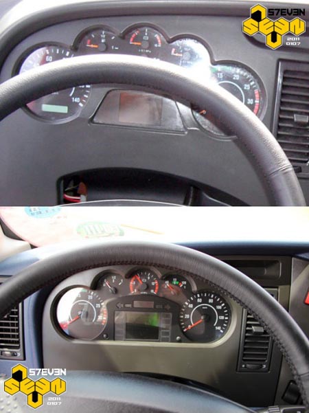 J6HC當(dāng)年的儀表臺是樣件,甚至沒有開皮紋。J6H采用與J6P一樣的儀表臺,雖然套色的結(jié)構(gòu)拜托了中國重卡惡俗的仿桃木習(xí)慣,但藍灰的顏色搭配可能并不是最好的選擇吧。