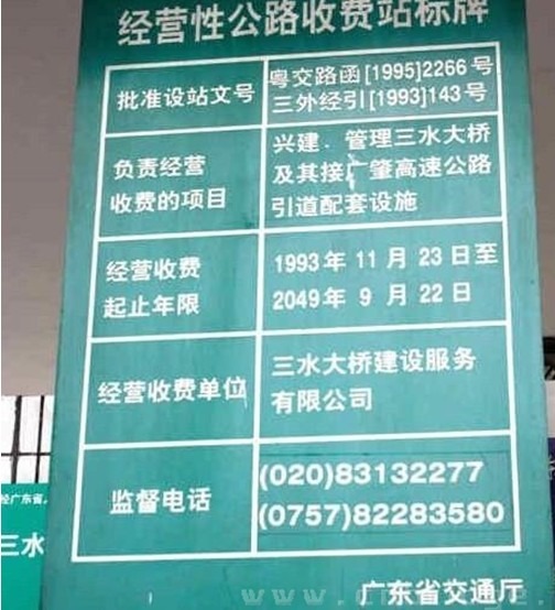 廣東佛山三水大橋,收費(fèi)起止年限從1993年11月23日到2049年9月22日,時(shí)間長(zhǎng)達(dá)55年多。此橋收費(fèi)引起群眾不滿。據(jù)了解,三水大橋工程投資約4.56億元,截至去年收費(fèi)達(dá)7.5億元人民幣。目前三水大橋已進(jìn)入純盈利期,如按現(xiàn)在路費(fèi)收入每天10萬元左右計(jì)算,到2049年將有近14億元收入。