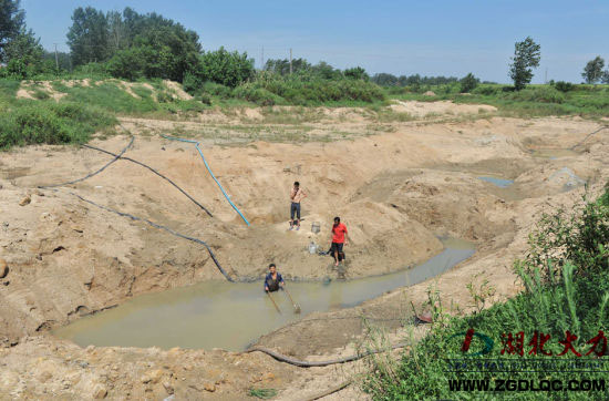 朱光城與三戶村民“組團(tuán)”請來一臺挖掘機(jī),挖了一個(gè)屬于他們的沙坑井?吹揭褲B了大半坑的水,朱光城眼睛一亮:“這些水可以灌一到兩畝田了。”