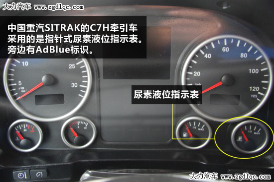 中國重汽SITRAK的C7H牽引車就采用的是指針式尿素液位指示表,位置儀表板的右下方,旁邊緊挨著燃油表。