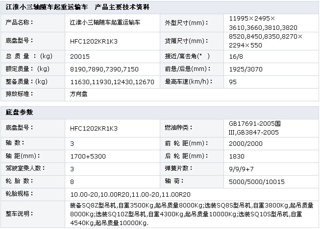 江淮小三軸隨車起重運(yùn)輸車  底盤型號(hào):HFC1202KR1K3 額定質(zhì)量:8190,7890,7390,7150