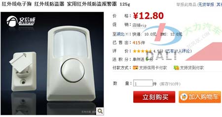 小編測試的這個紅外報(bào)警器是在淘寶商城上買的,非常的便宜才12.8元,加上10快錢的郵費(fèi)也就20多塊。